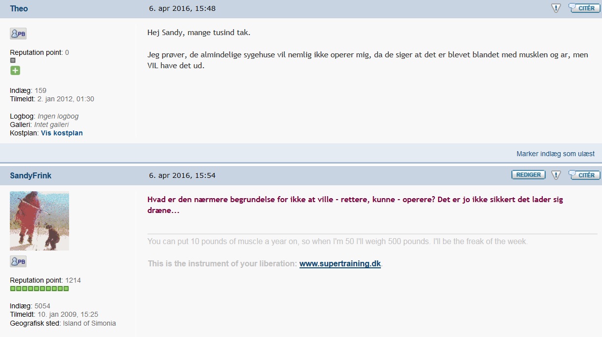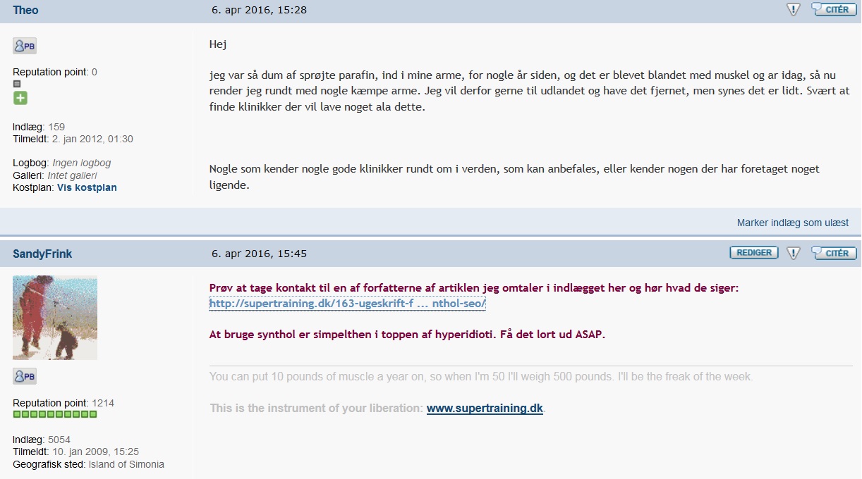 Inde på Bodybuilding.dk var der forleden en bruger der anonymt beder om hjælp, idet han har injiceret paraffin ind i armene og nu gerne vil have det fjernet. Men det er ikke bare sådan…hvilket screenshotsne forklarer:
