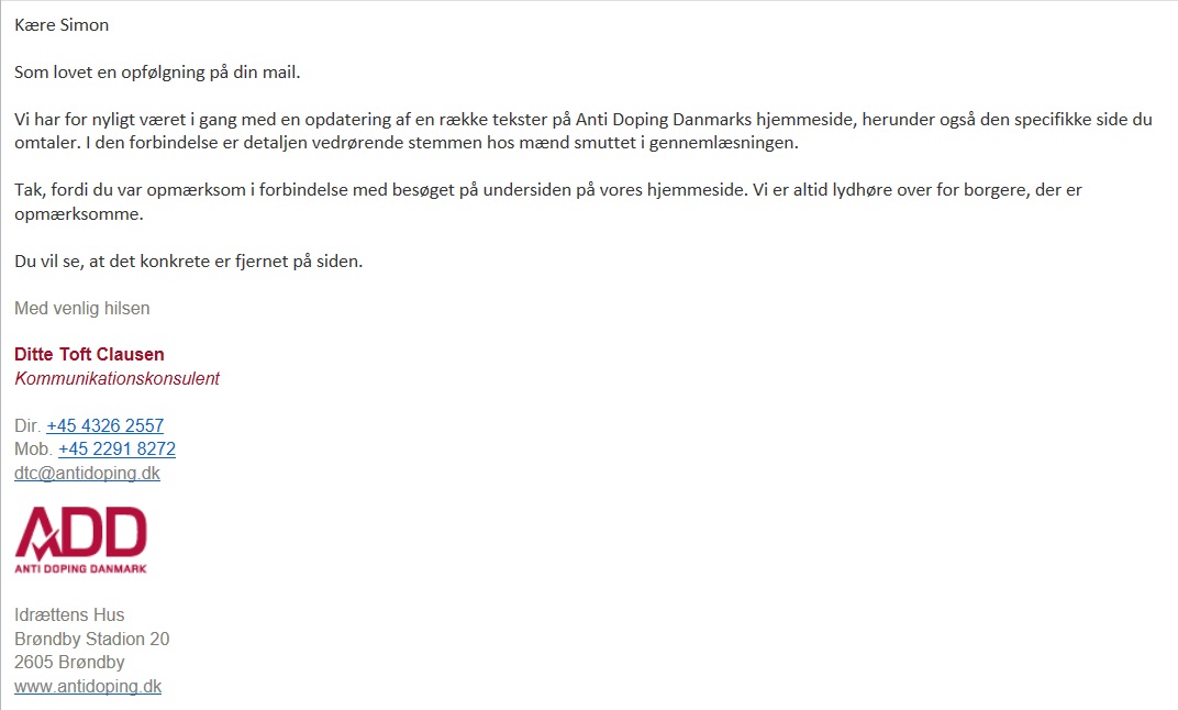 Jeg skrev derfor til DR.dk og fremførte som blot ét af mange kritikpunkter, at denne oplysning ikke passer. Eller at jeg i hvert fald aldrig havde set den underbygget. Og jeg skrev også til DR at; “Jeg forventer naturligvis, at I retter artiklen såfremt Anti Doping Danmark ikke evner at præsentere nogen tilfredsstillende evidens for påstanden.”